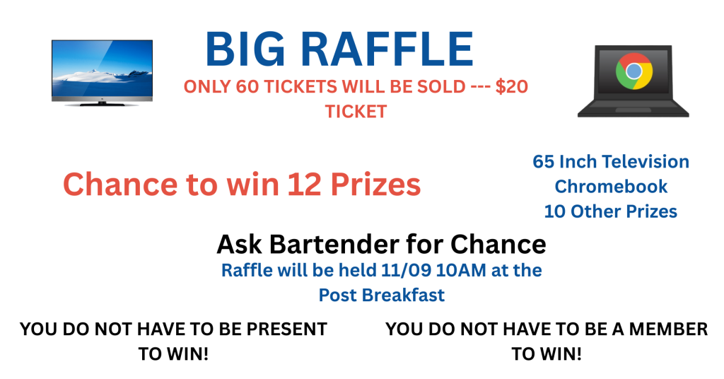 We also elected Fernando Delgato as our Junior Vice, you can see a list of Officers here: Officers – The American Legion Post 1207 Fernando was the Junior Vice last year and did a wonderful job. A scheduling conflict kept him from running this year but that has since been resolved. The Junior Vice is both extremely busy and extremely vital to a Post as they are both the Poppy Chairman to help us raise money to help Veterans outside the Post and responsible for planning Legion events, such as the Corn Boil, Feather Party, Trunk or Treat (Planned this year by Ricky Smith in lieu of a Junior Vice), and so forth. Welcome back Fernando!